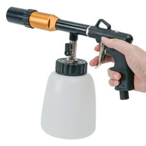 The AT-201A Cleaning Gun is a pneumatically operated suction spray gun that both air and liquid cleaners atomizes and swirling sprays with high pressure. The special cleaning liquid is very finely atomized by the Tornado effect in the nozzle of the AT-201A and then sprayed onto the soiled surfaces under pressure. As a result, the cleaning effect of the fluid will be used optimally, resulting in a thorough cleaning of all velour interior parts. Also, loose floor mats are getting again spotless with this method.